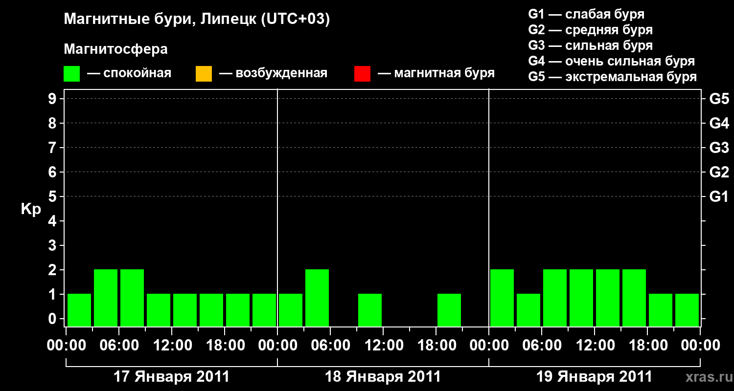 Изменения геомагнитного индекса Kp с 17 по 19 января 2011 года для средних широт