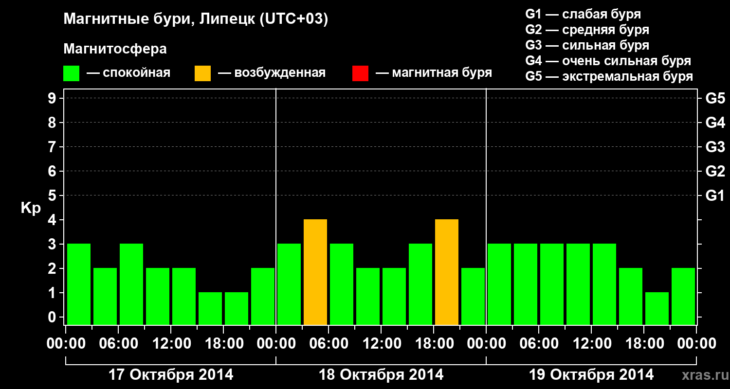 Изменения геомагнитного индекса Kp с 17 по 19 октября 2014 года для средних широт