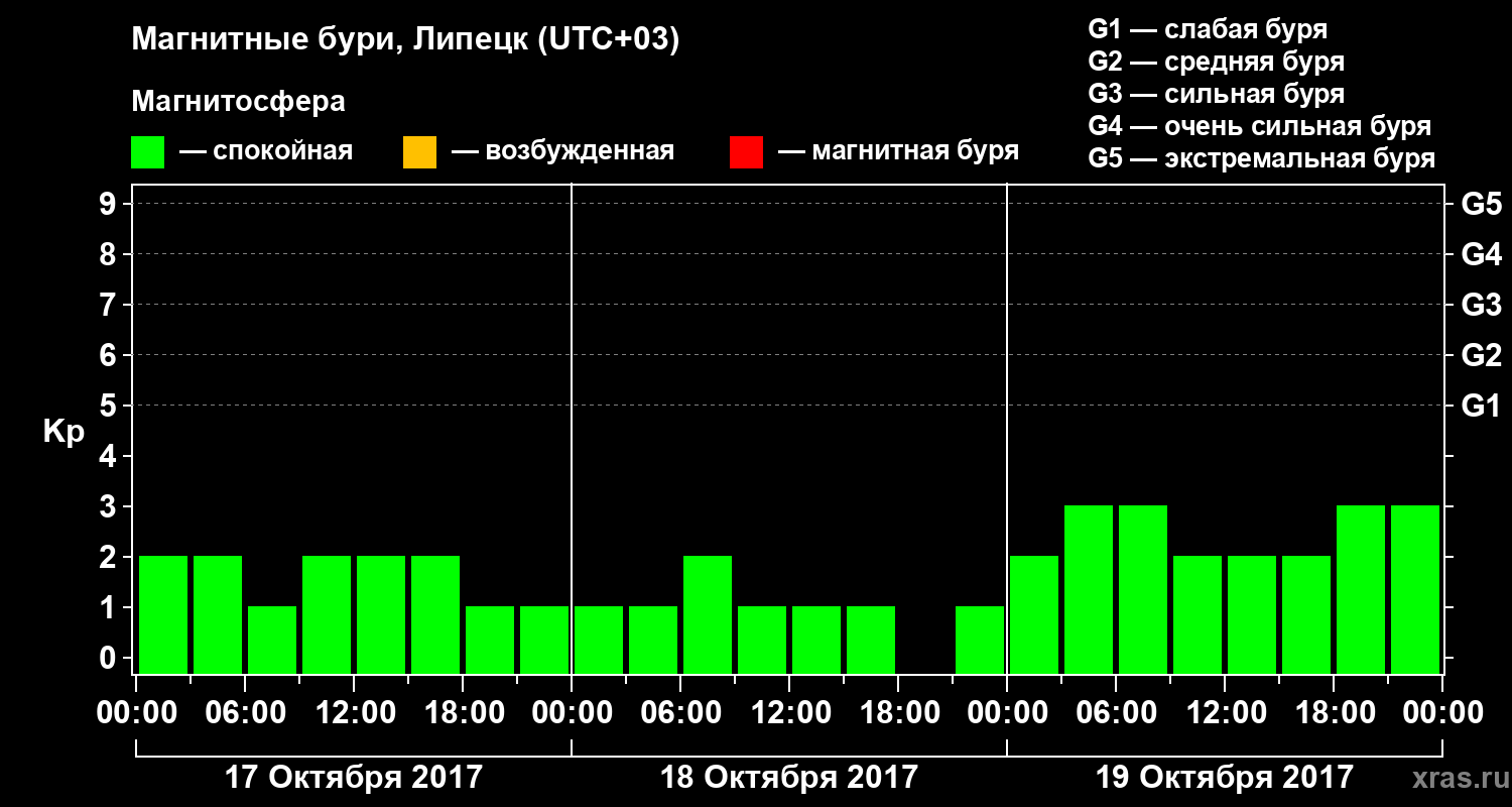 Изменения геомагнитного индекса Kp с 17 по 19 октября 2017 года для средних широт