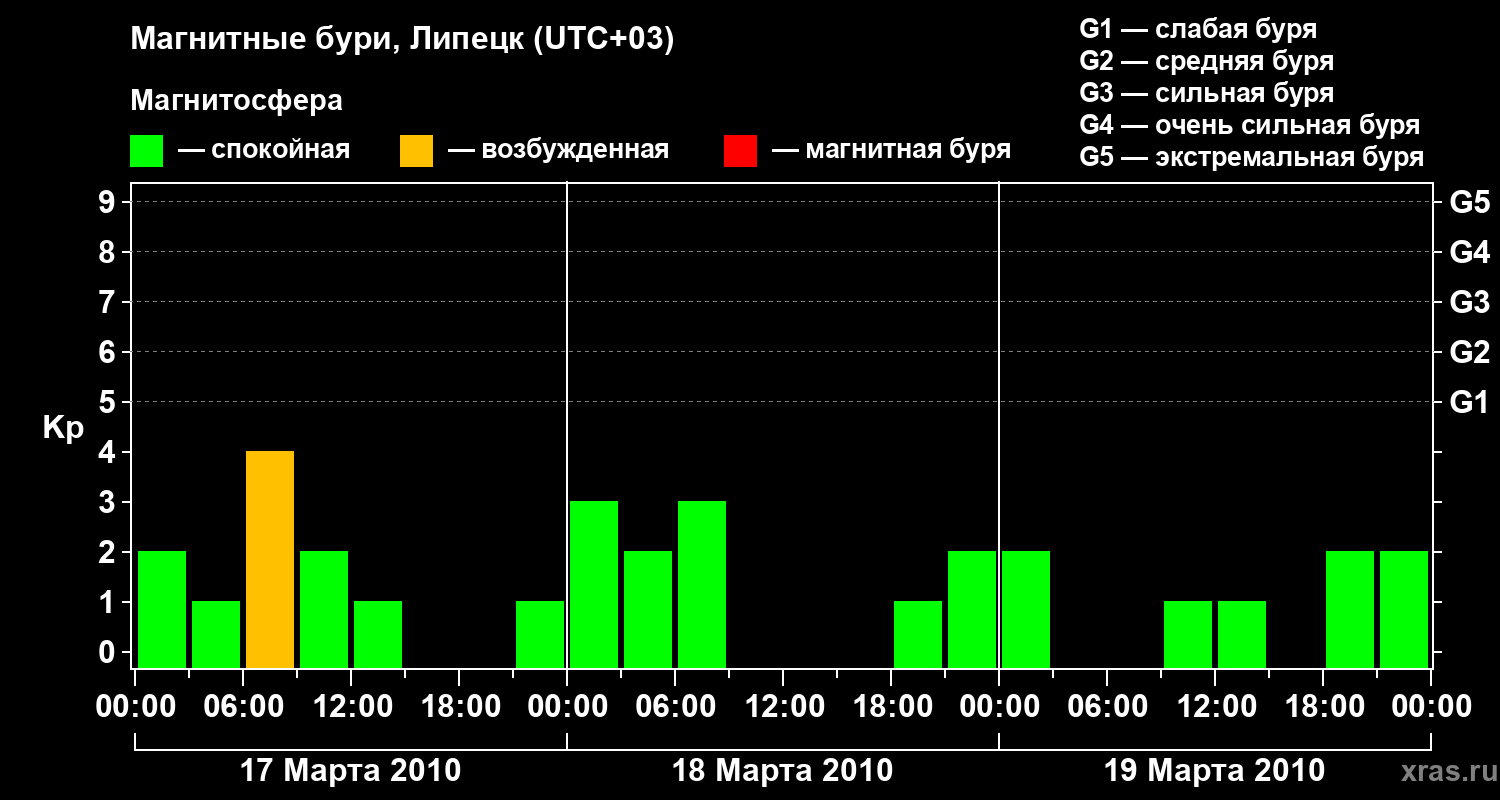 Изменения геомагнитного индекса Kp с 17 по 19 марта 2010 года для средних широт