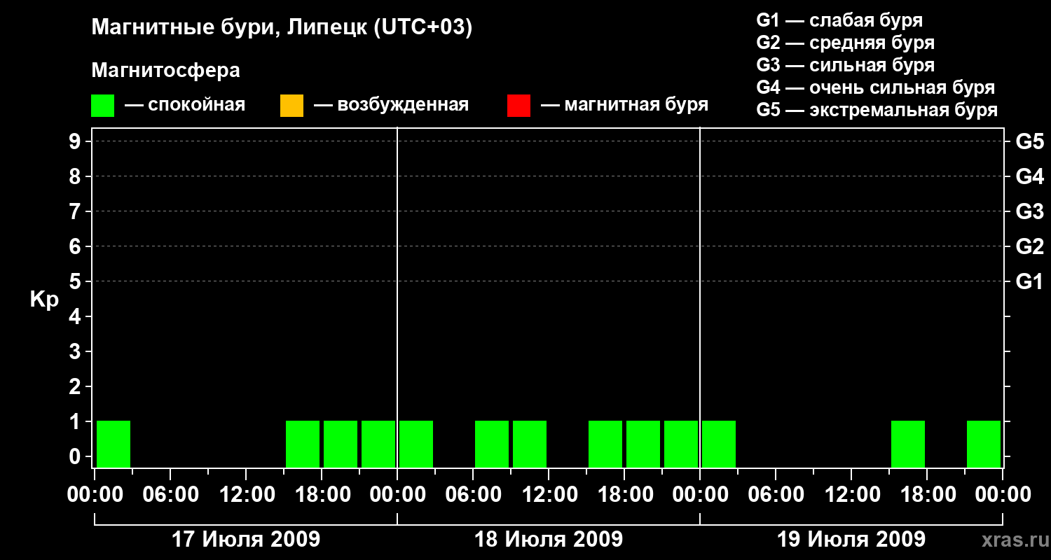 Изменения геомагнитного индекса Kp с 17 по 19 июля 2009 года для средних широт