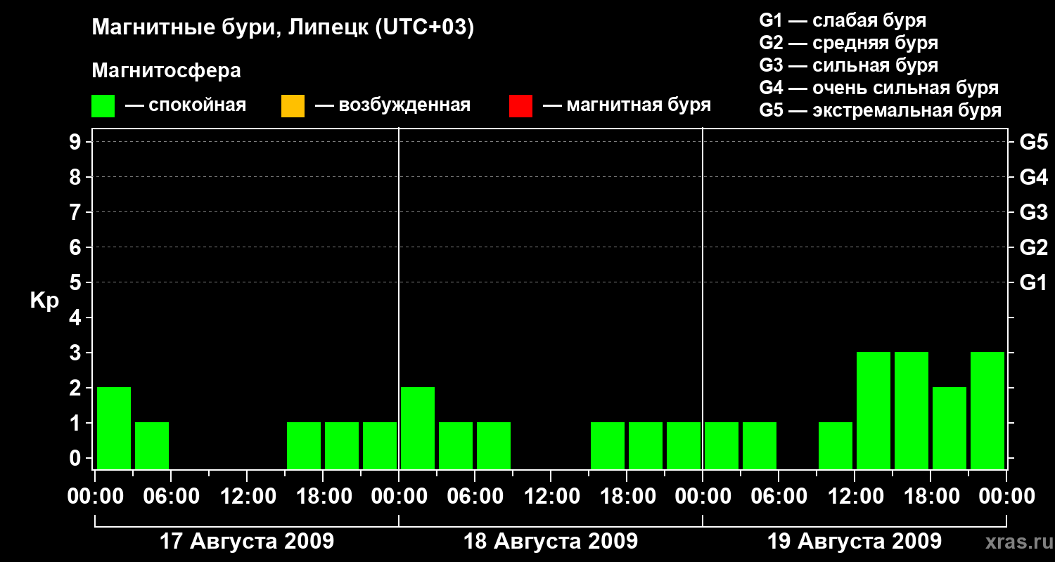 Изменения геомагнитного индекса Kp с 17 по 19 августа 2009 года для средних широт