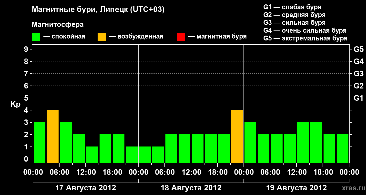 Изменения геомагнитного индекса Kp с 17 по 19 августа 2012 года для средних широт