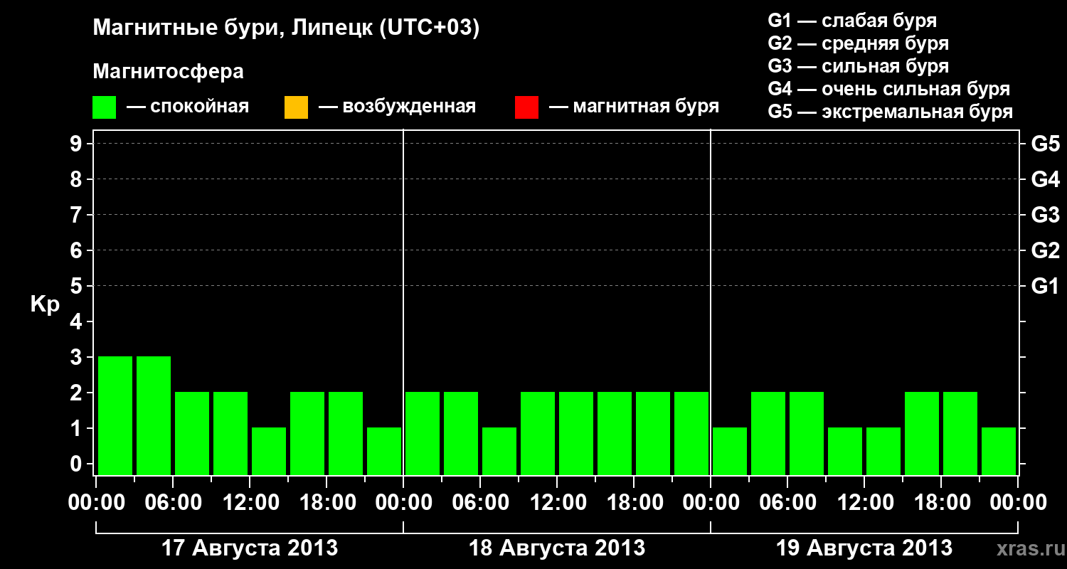 Изменения геомагнитного индекса Kp с 17 по 19 августа 2013 года для средних широт