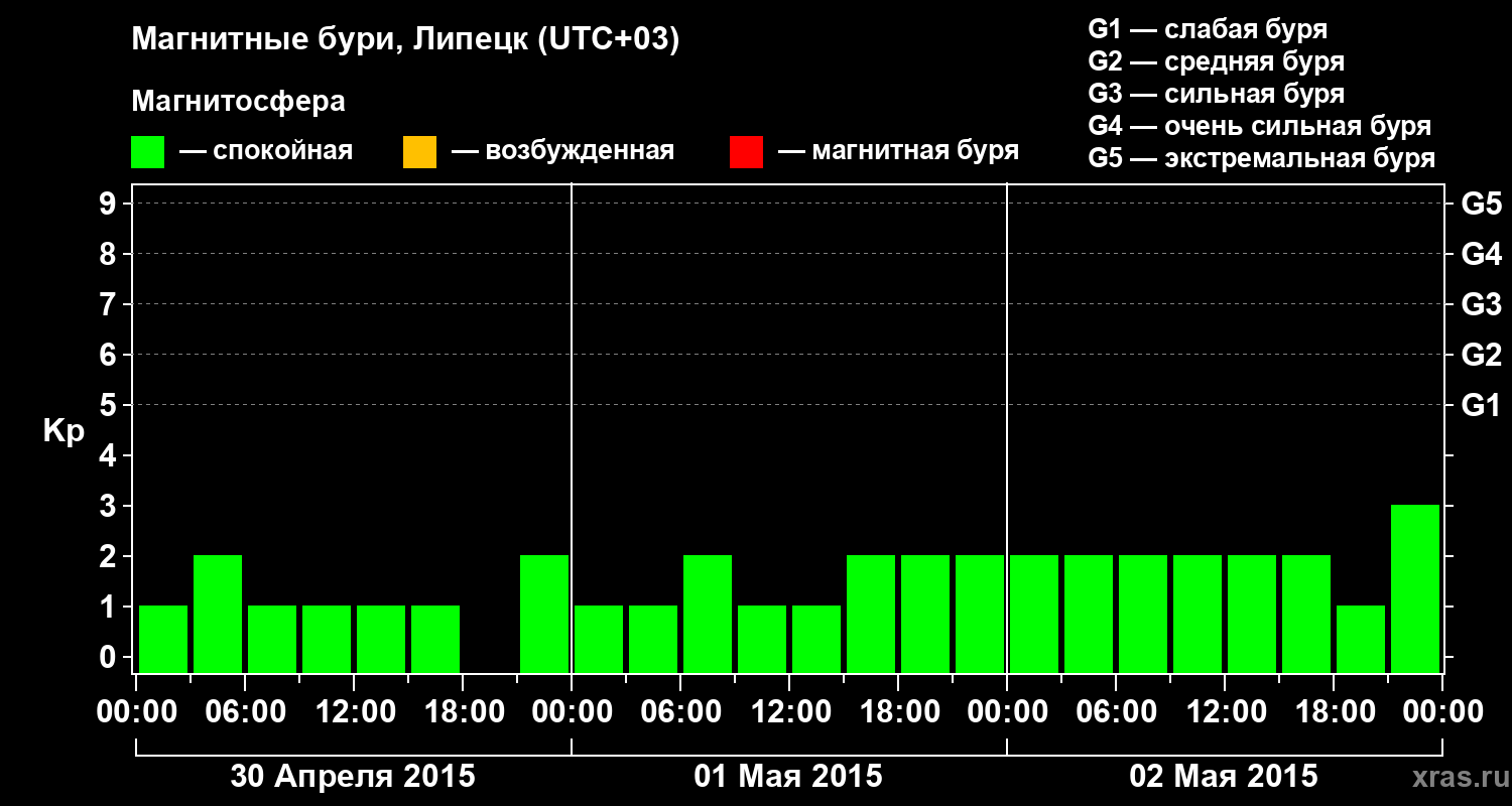 Изменения геомагнитного индекса Kp с 30 апреля по 2 мая 2015 года для средних широт