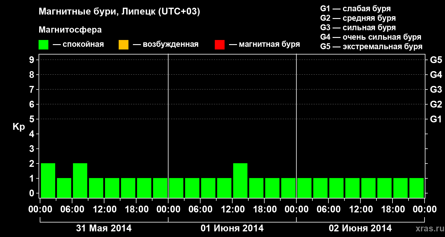 Изменения геомагнитного индекса Kp с 31 мая по 2 июня 2014 года для средних широт