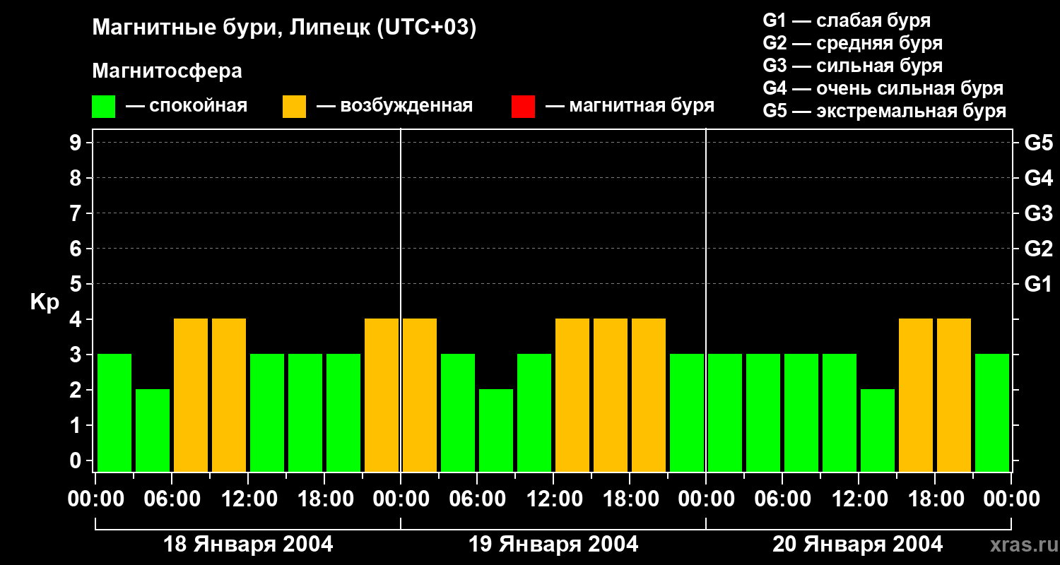 Изменения геомагнитного индекса Kp с 18 по 20 января 2004 года для средних широт