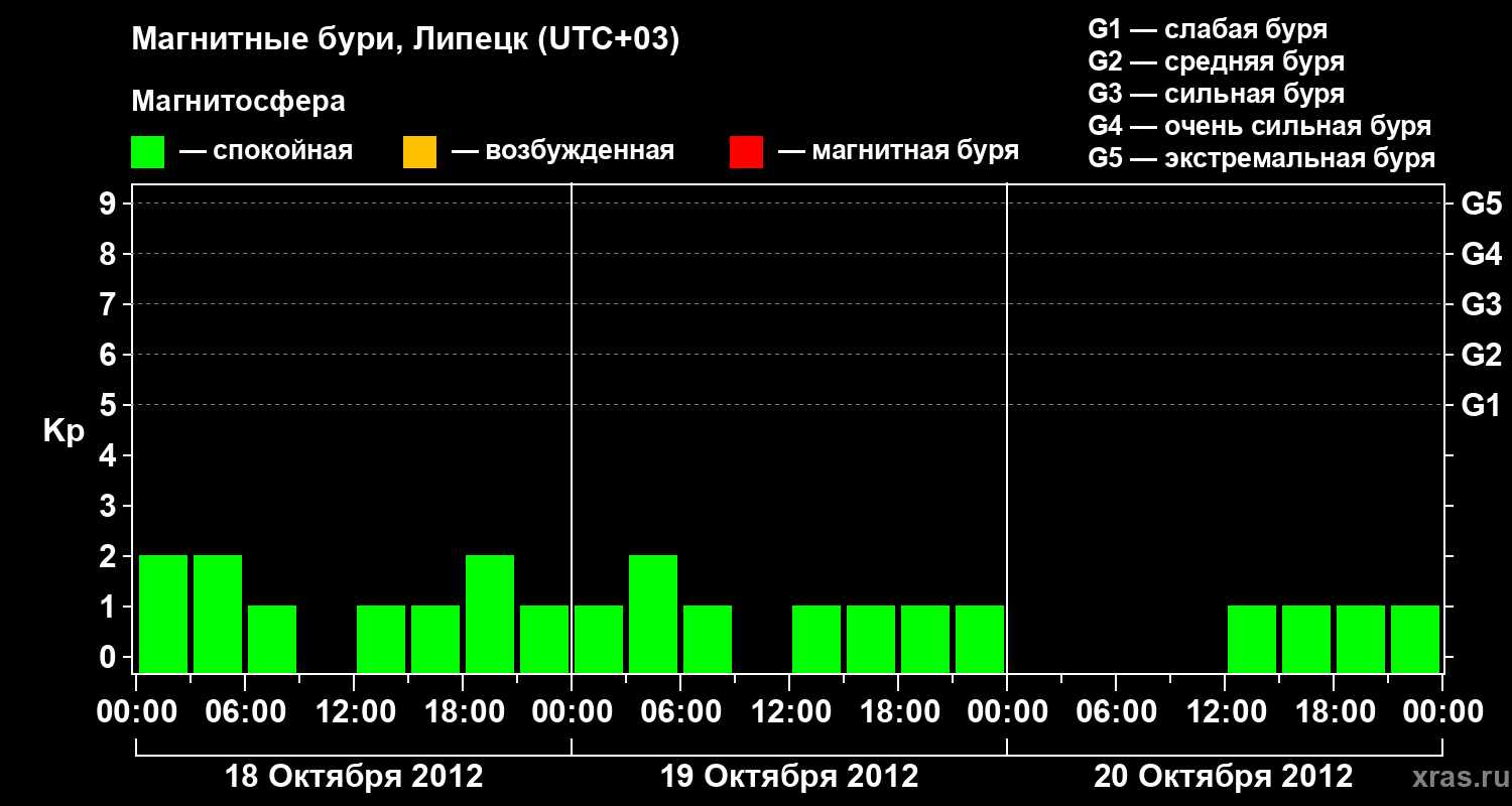 Изменения геомагнитного индекса Kp с 18 по 20 октября 2012 года для средних широт