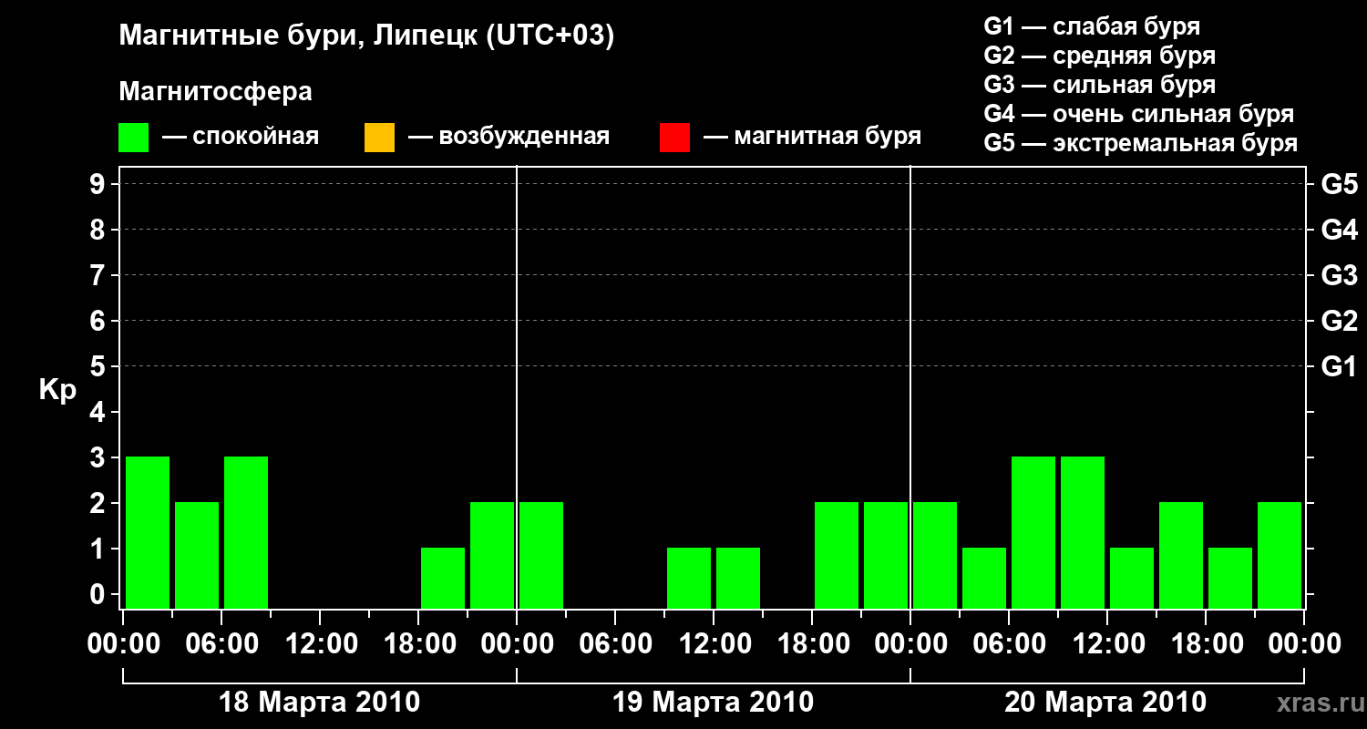 Изменения геомагнитного индекса Kp с 18 по 20 марта 2010 года для средних широт