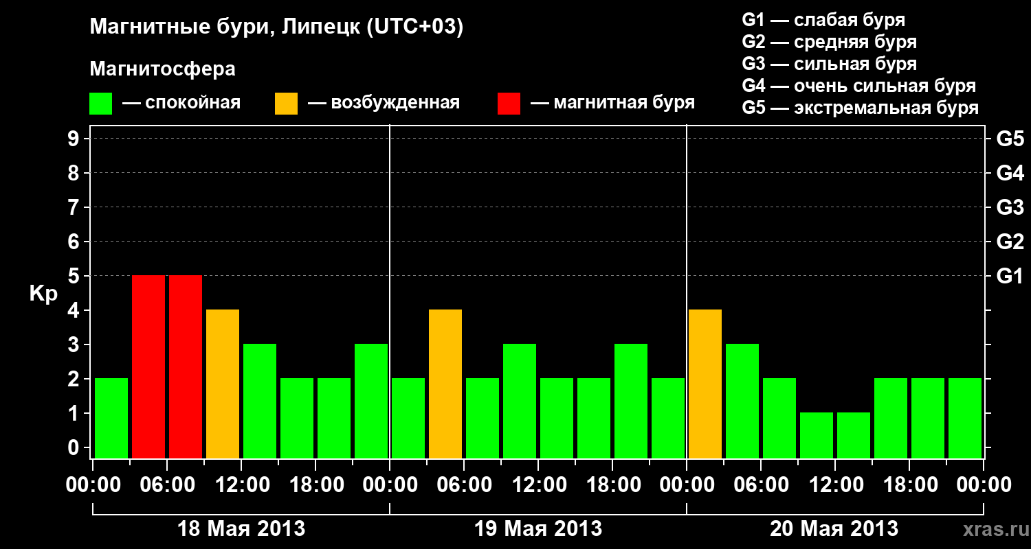 Изменения геомагнитного индекса Kp с 18 по 20 мая 2013 года для средних широт