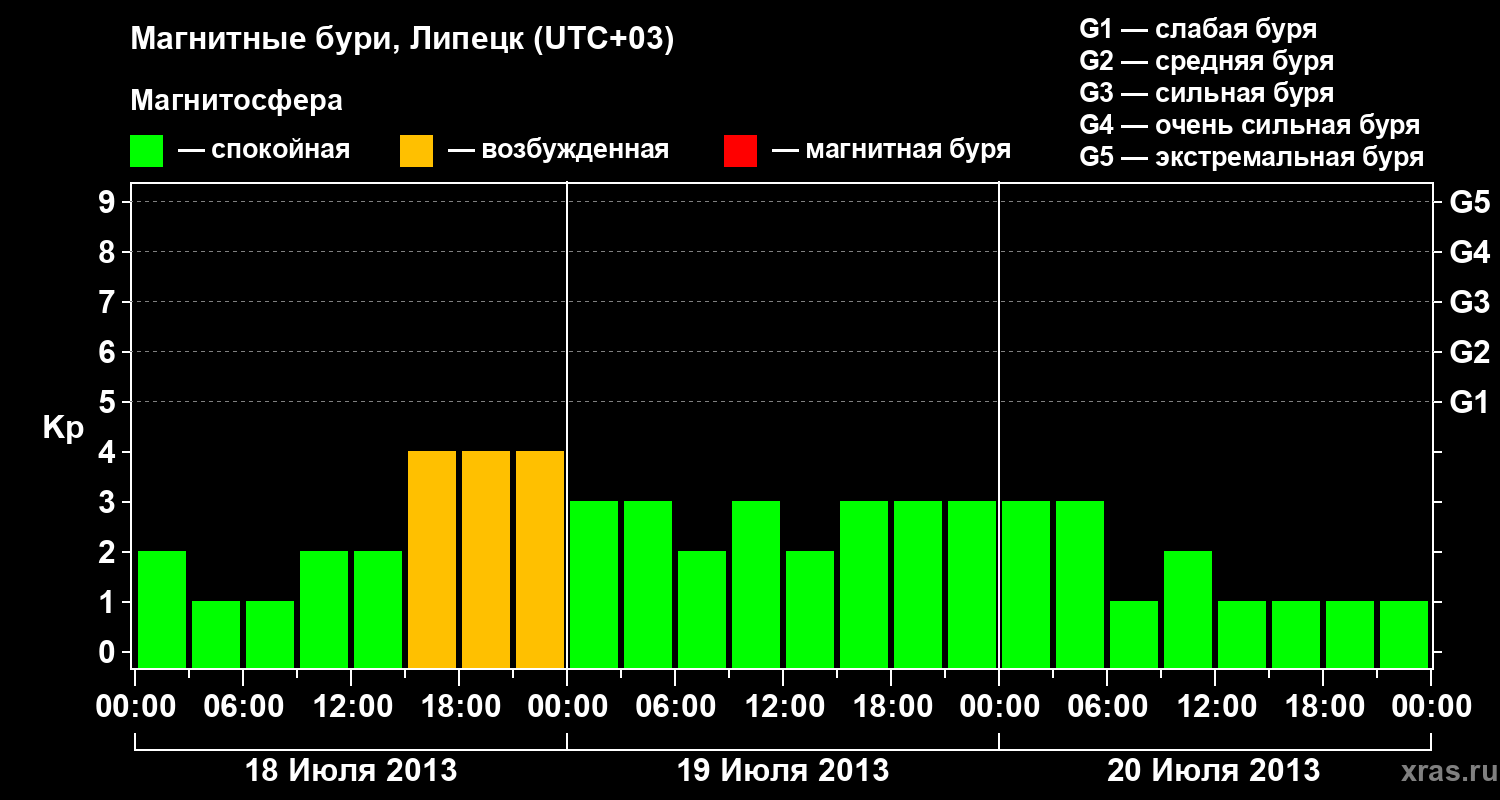 Изменения геомагнитного индекса Kp с 18 по 20 июля 2013 года для средних широт