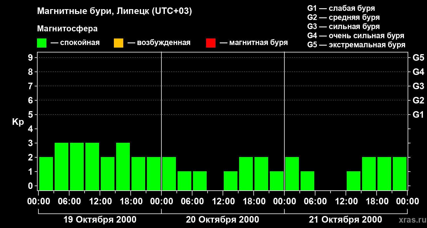 Изменения геомагнитного индекса Kp с 19 по 21 октября 2000 года для средних широт