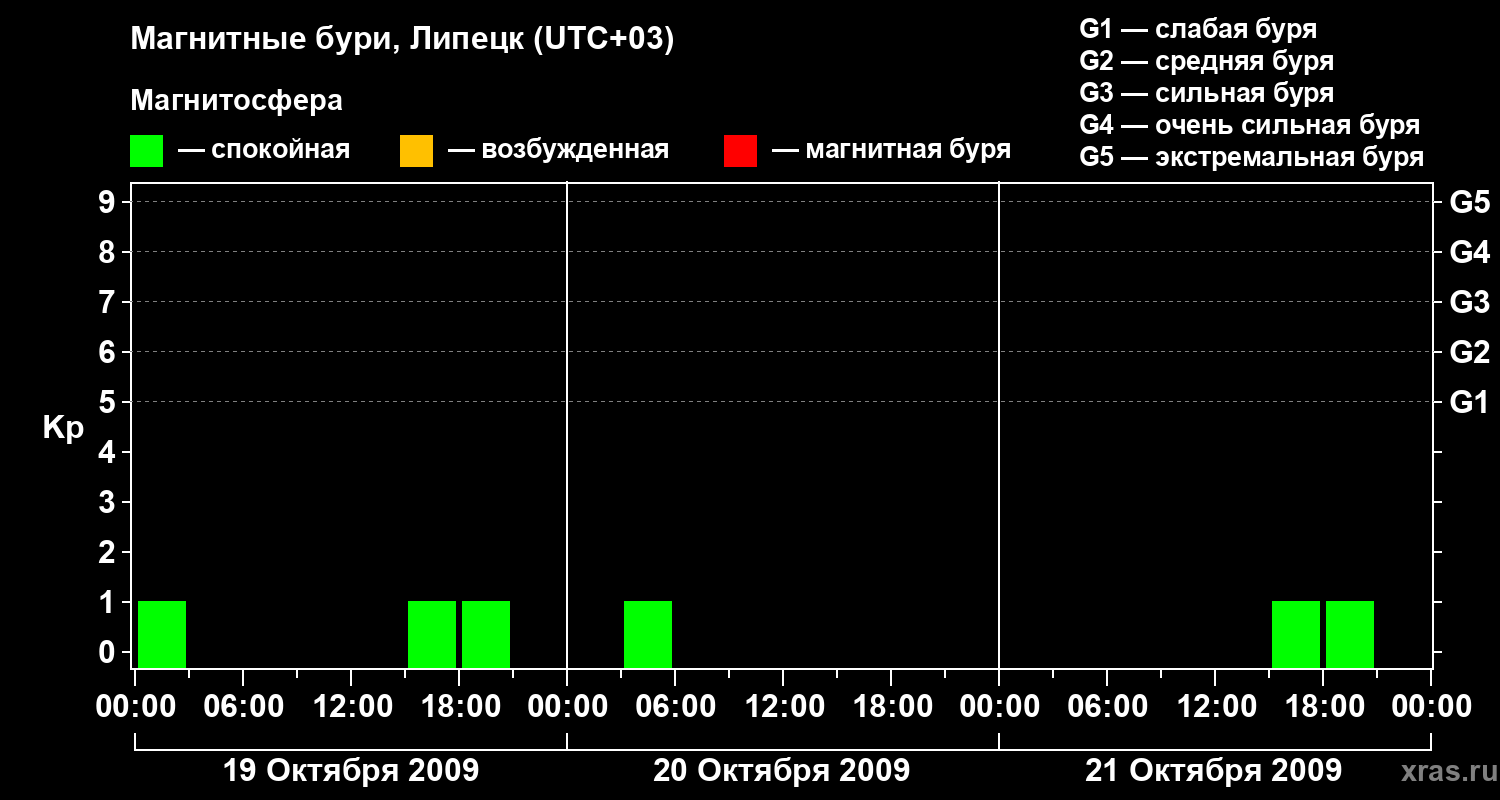 Изменения геомагнитного индекса Kp с 19 по 21 октября 2009 года для средних широт