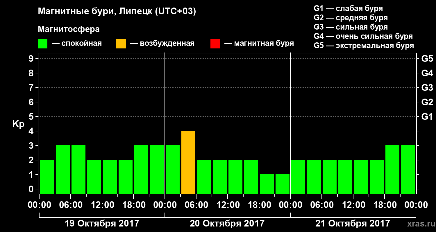 Изменения геомагнитного индекса Kp с 19 по 21 октября 2017 года для средних широт