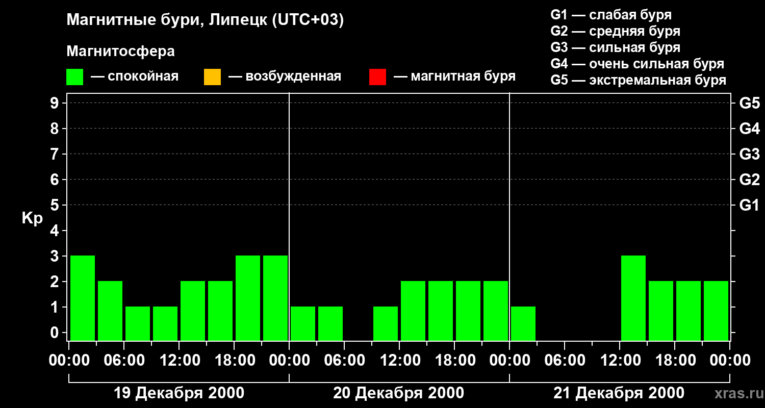 Изменения геомагнитного индекса Kp с 19 по 21 декабря 2000 года для средних широт
