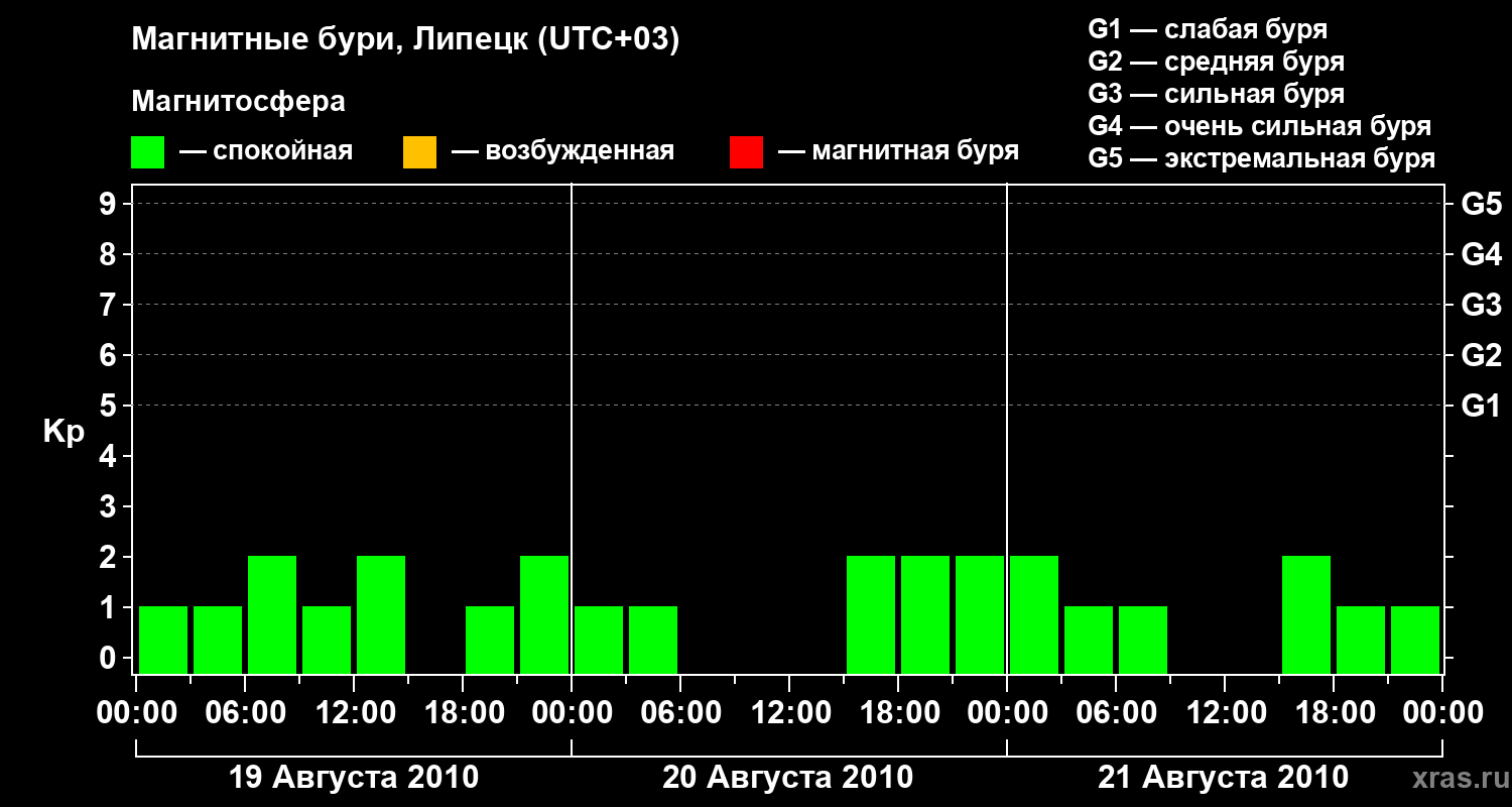 Изменения геомагнитного индекса Kp с 19 по 21 августа 2010 года для средних широт