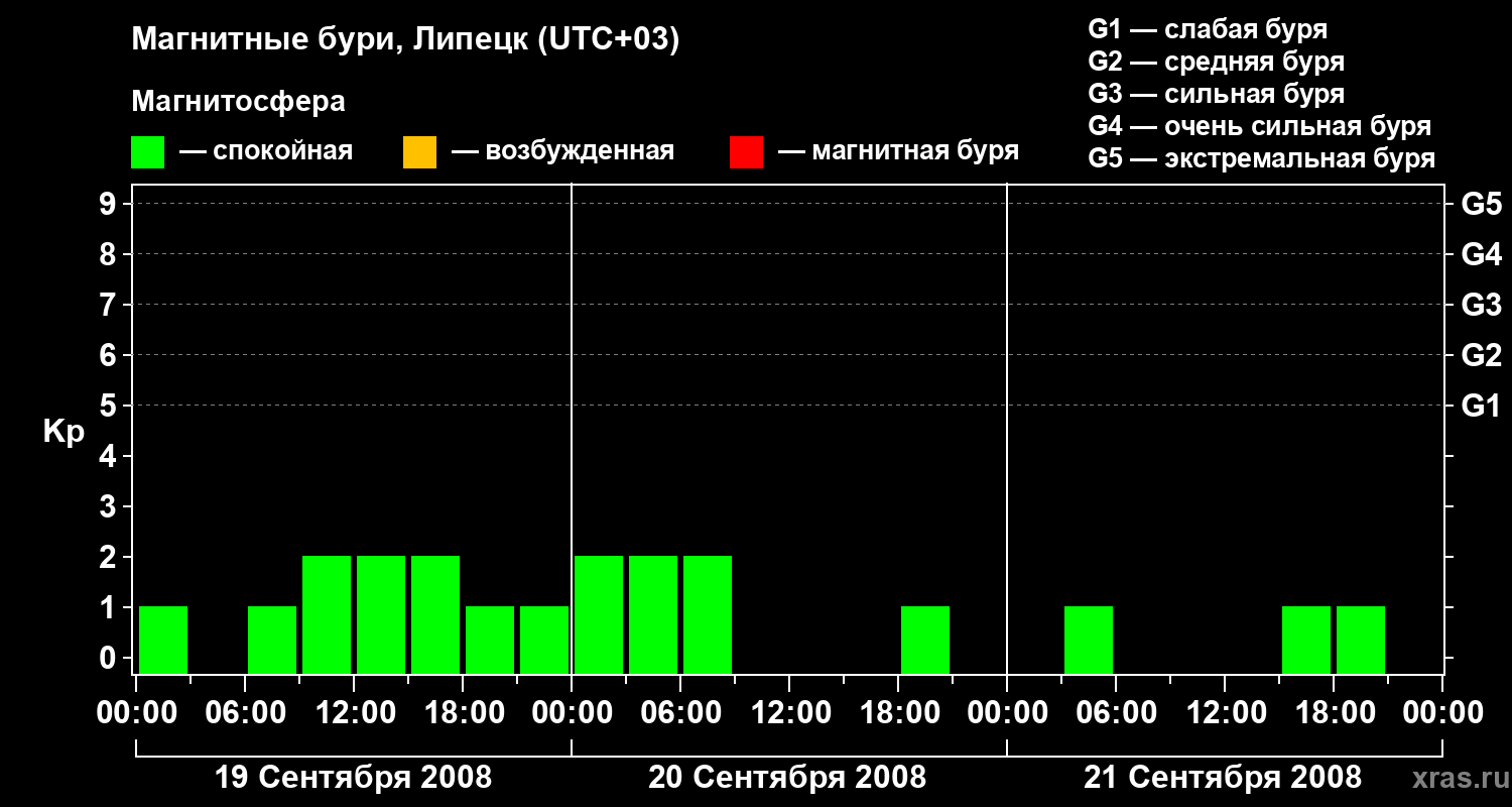 Изменения геомагнитного индекса Kp с 19 по 21 сентября 2008 года для средних широт