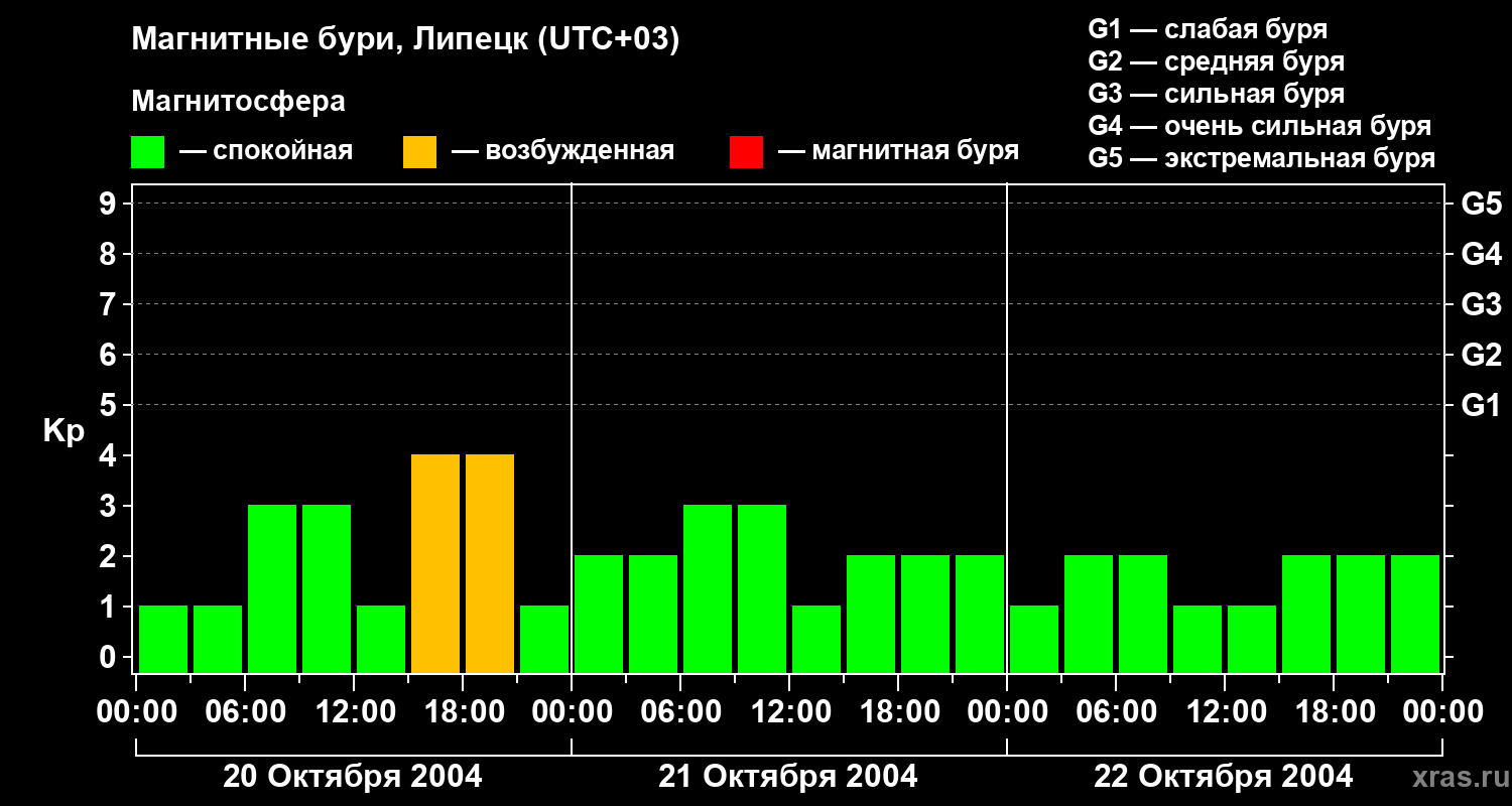 Изменения геомагнитного индекса Kp с 20 по 22 октября 2004 года для средних широт