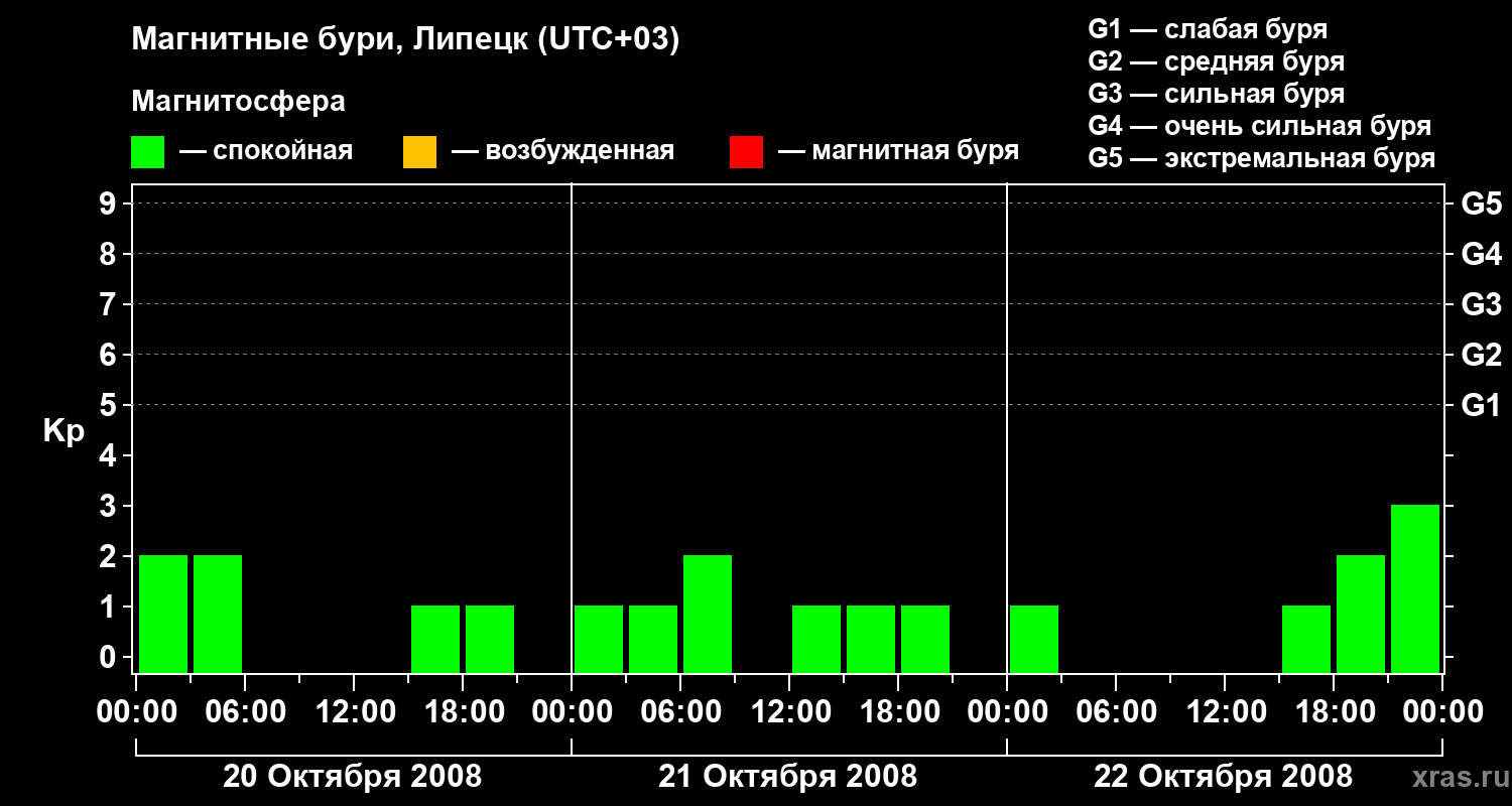 Изменения геомагнитного индекса Kp с 20 по 22 октября 2008 года для средних широт