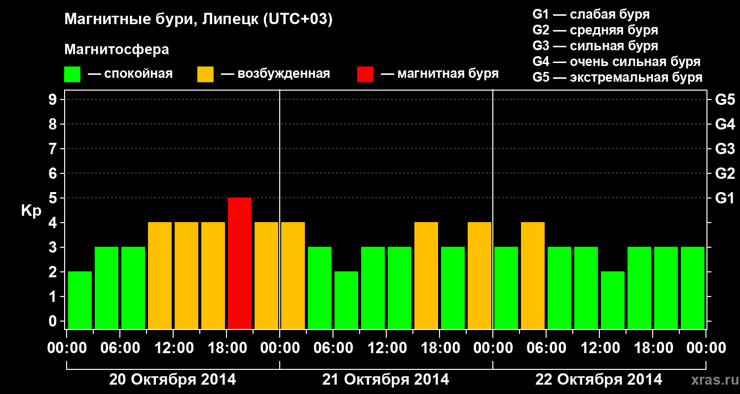 Изменения геомагнитного индекса Kp с 20 по 22 октября 2014 года для средних широт