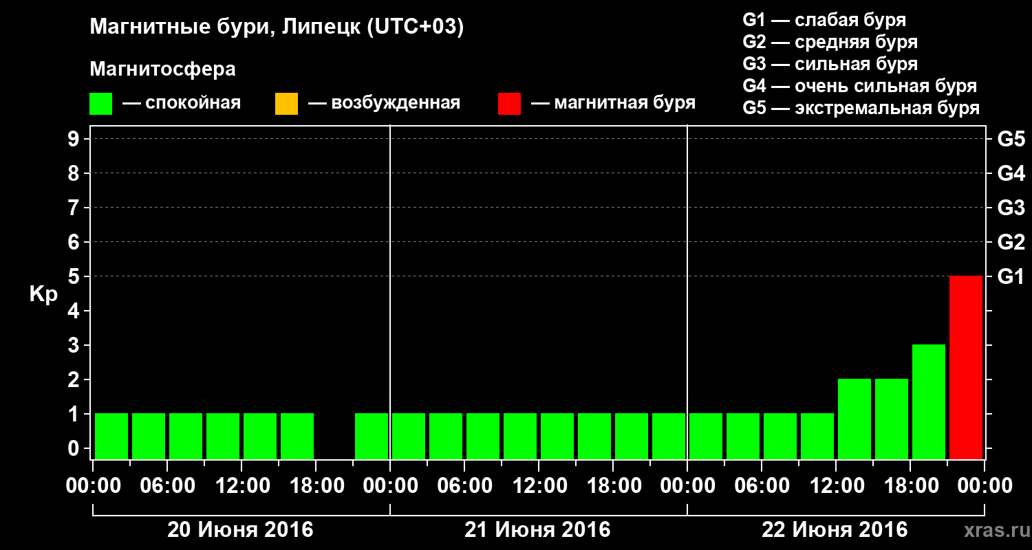 Изменения геомагнитного индекса Kp с 20 по 22 июня 2016 года для средних широт