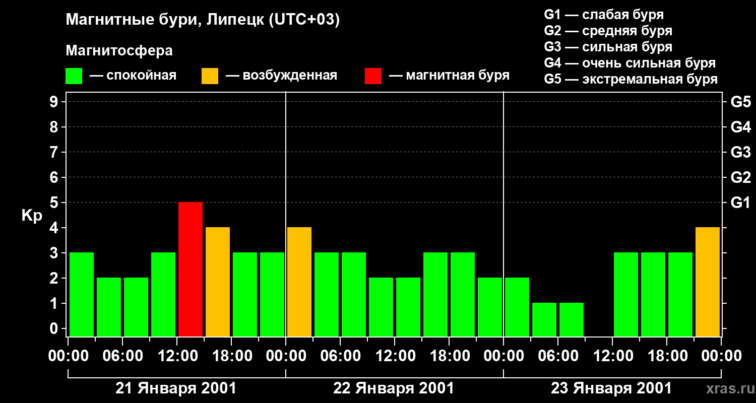 Изменения геомагнитного индекса Kp с 21 по 23 января 2001 года для средних широт