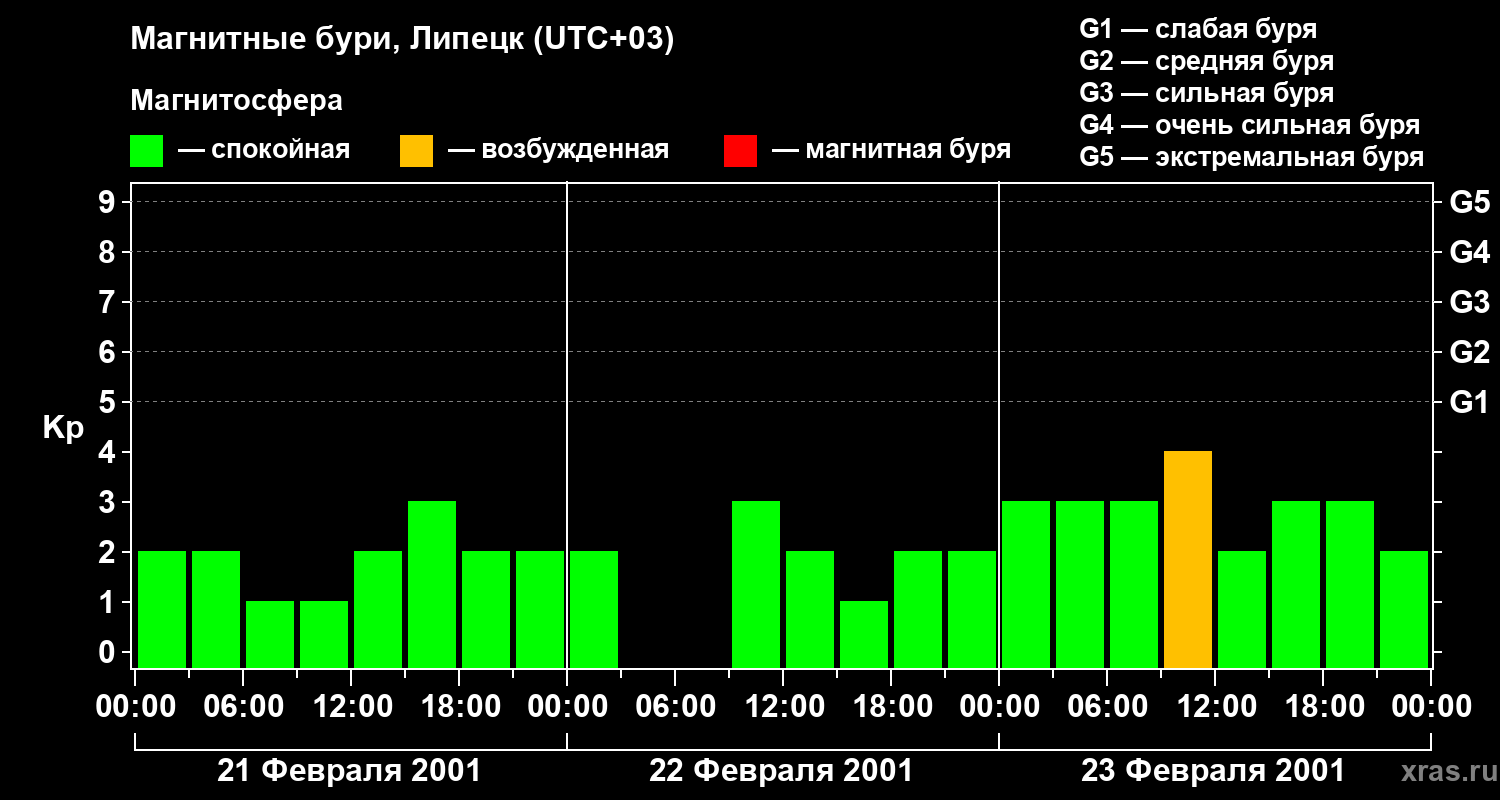 Изменения геомагнитного индекса Kp с 21 по 23 февраля 2001 года для средних широт