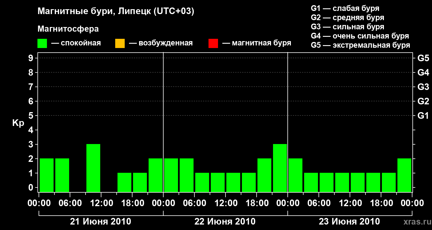 Изменения геомагнитного индекса Kp с 21 по 23 июня 2010 года для средних широт