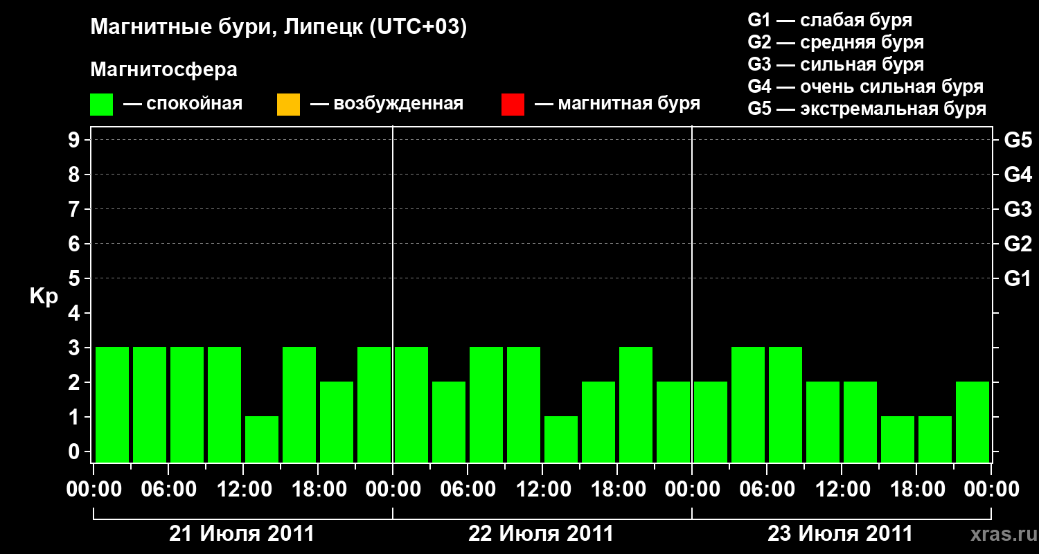 Изменения геомагнитного индекса Kp с 21 по 23 июля 2011 года для средних широт