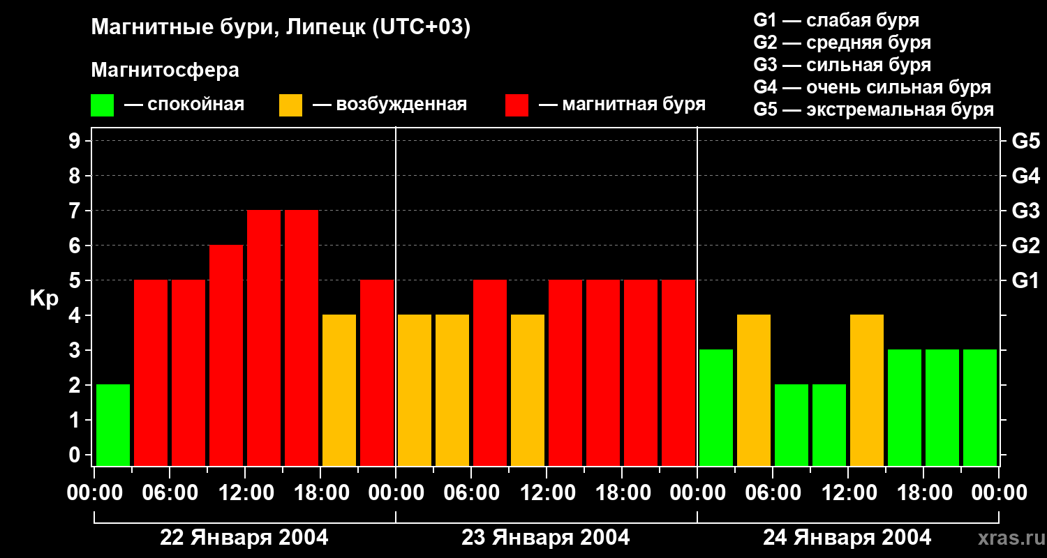 Изменения геомагнитного индекса Kp с 22 по 24 января 2004 года для средних широт