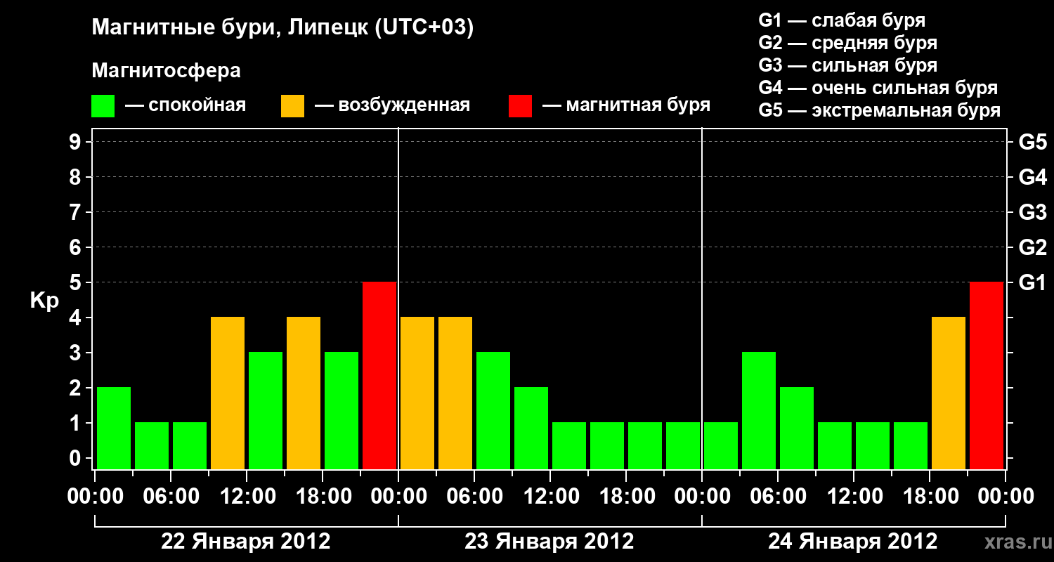 Изменения геомагнитного индекса Kp с 22 по 24 января 2012 года для средних широт