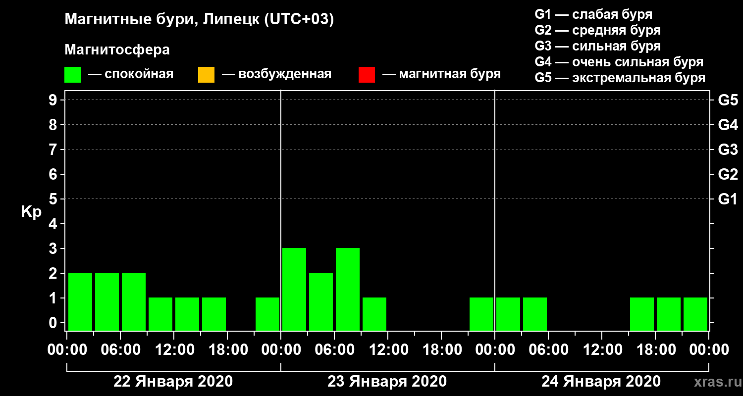 Изменения геомагнитного индекса Kp с 22 по 24 января 2020 года для средних широт
