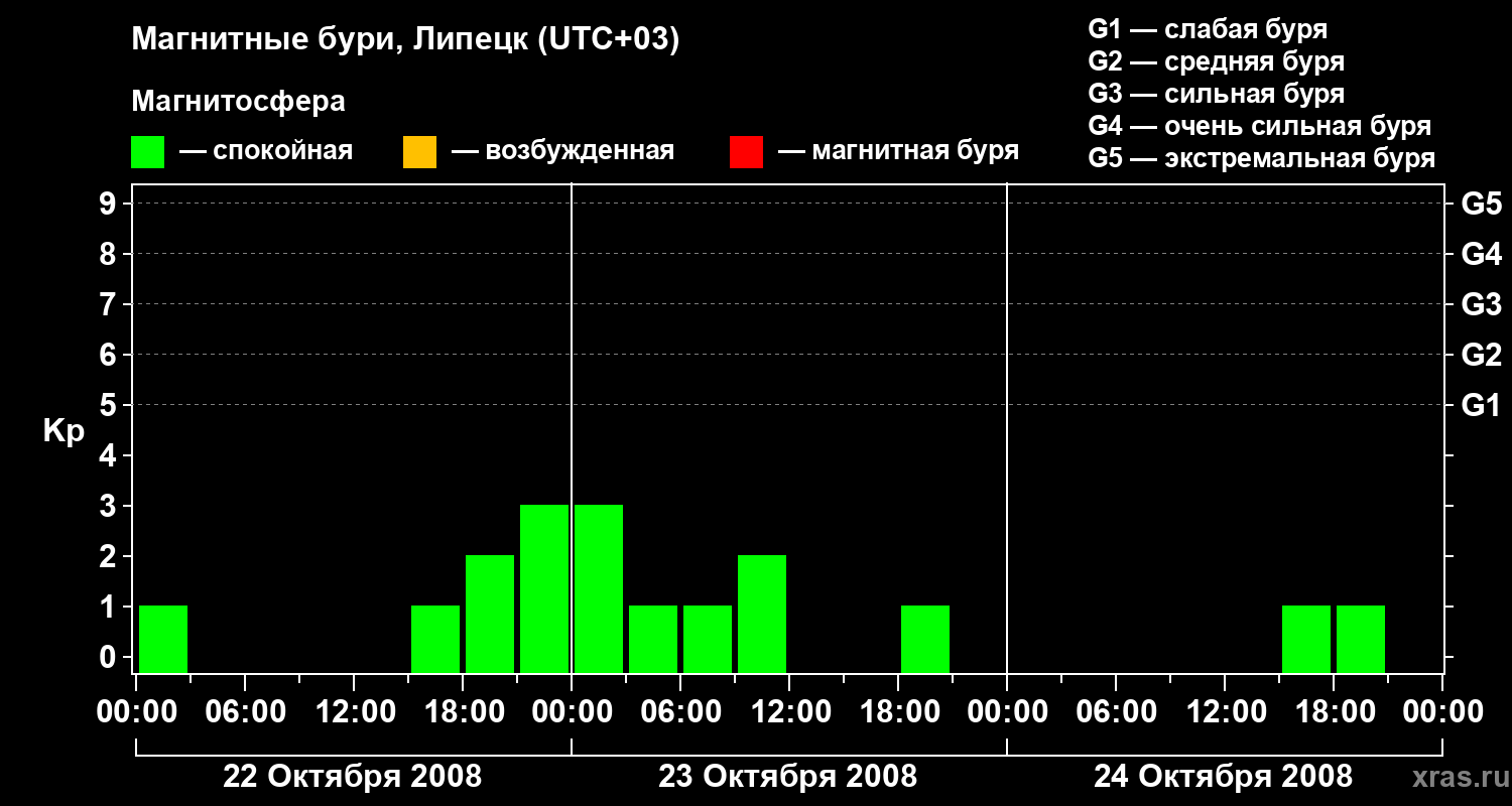 Изменения геомагнитного индекса Kp с 22 по 24 октября 2008 года для средних широт