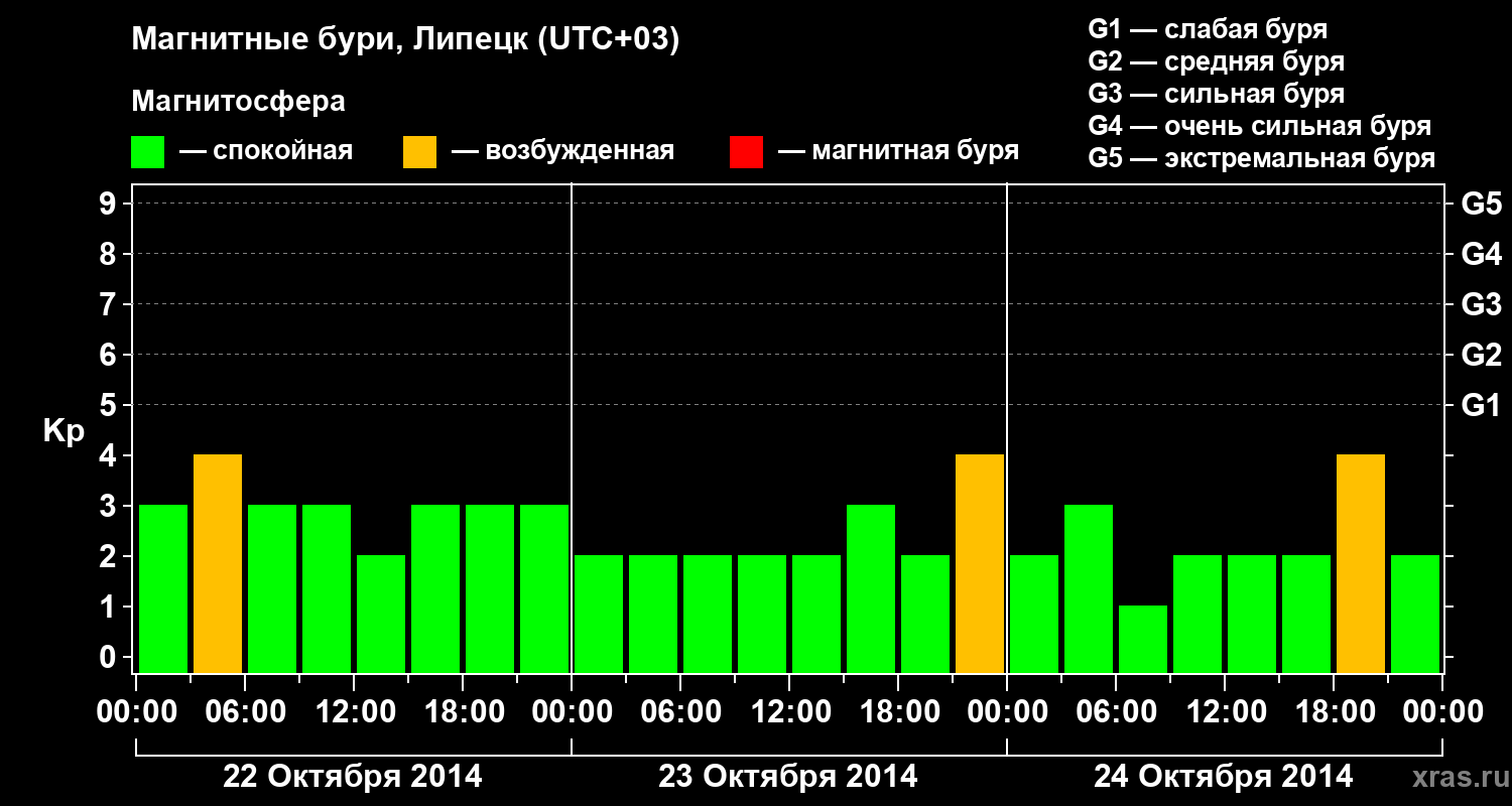 Изменения геомагнитного индекса Kp с 22 по 24 октября 2014 года для средних широт