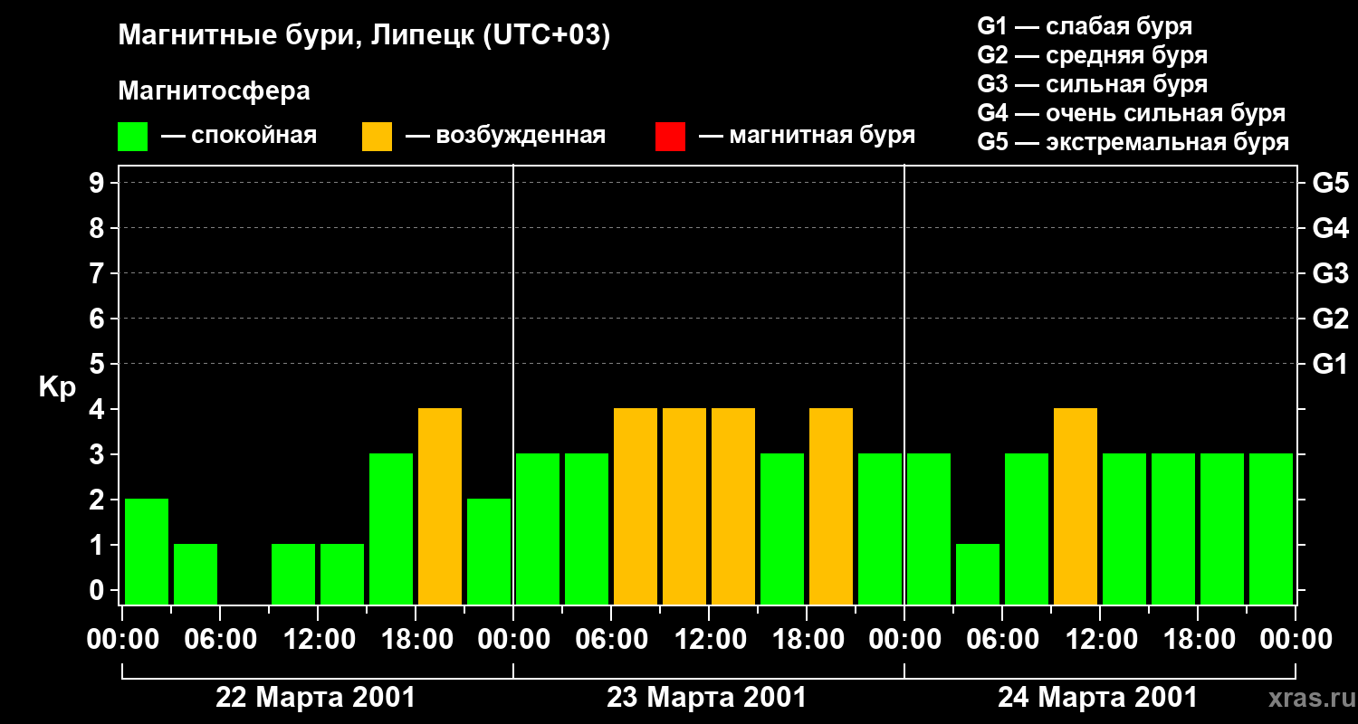 Изменения геомагнитного индекса Kp с 22 по 24 марта 2001 года для средних широт