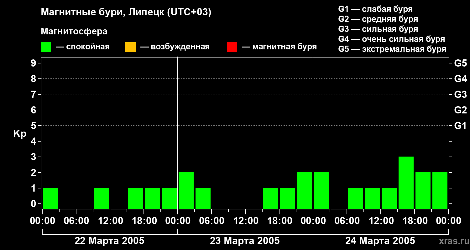 Изменения геомагнитного индекса Kp с 22 по 24 марта 2005 года для средних широт