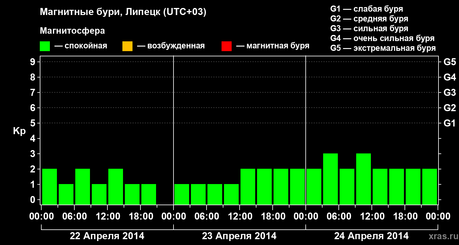 Изменения геомагнитного индекса Kp с 22 по 24 апреля 2014 года для средних широт