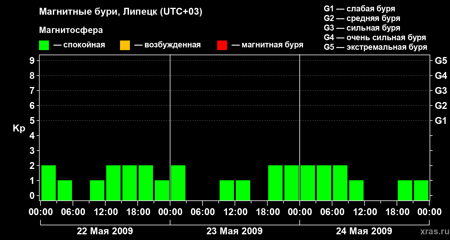 Изменения геомагнитного индекса Kp с 22 по 24 мая 2009 года для средних широт