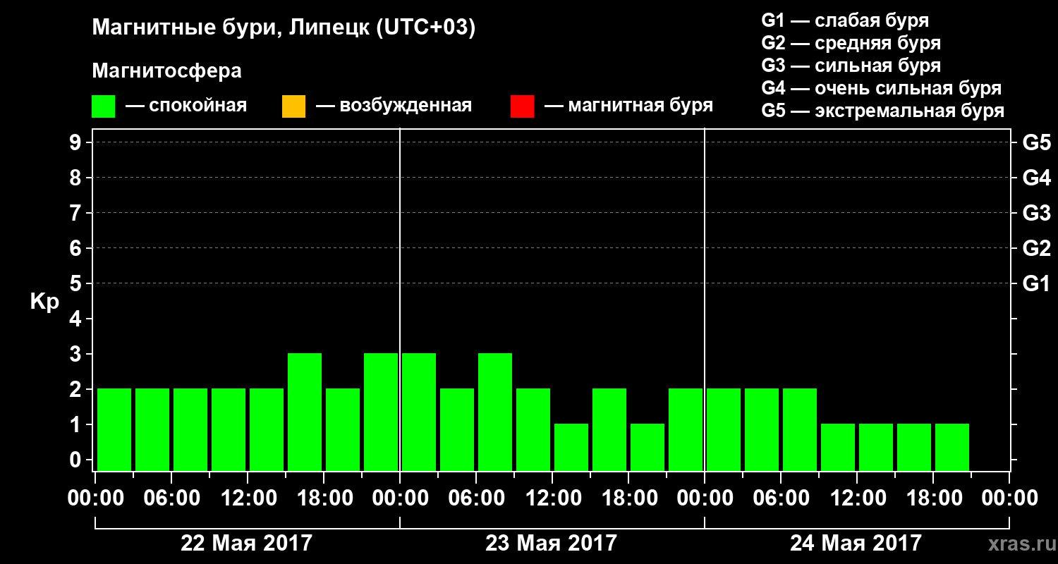 Изменения геомагнитного индекса Kp с 22 по 24 мая 2017 года для средних широт