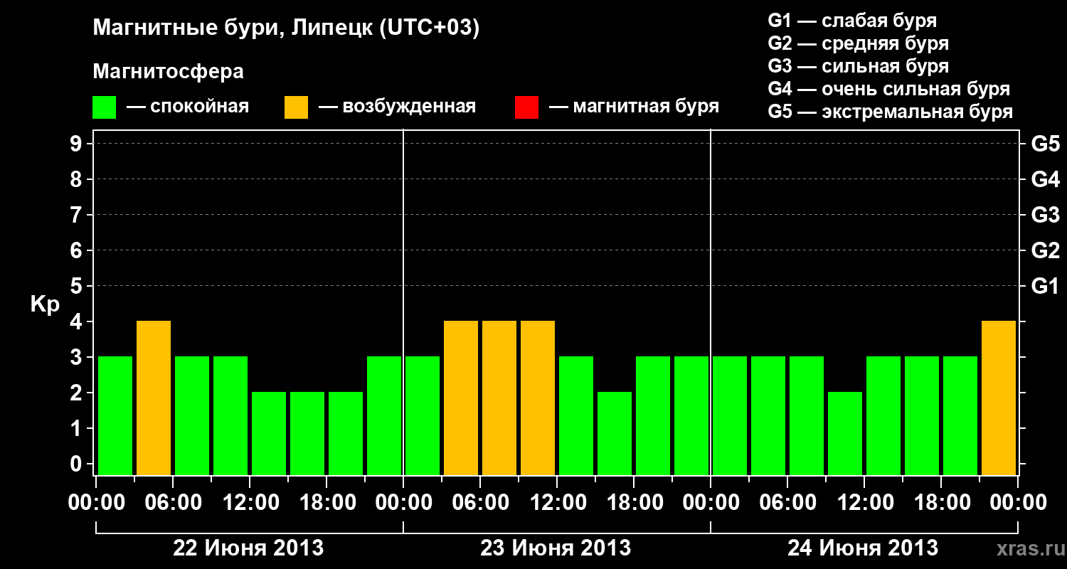 Изменения геомагнитного индекса Kp с 22 по 24 июня 2013 года для средних широт