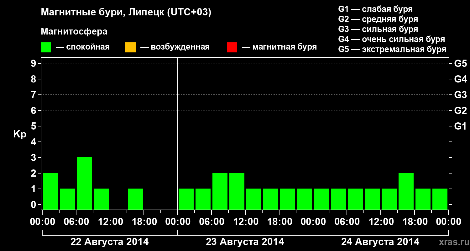 Изменения геомагнитного индекса Kp с 22 по 24 августа 2014 года для средних широт