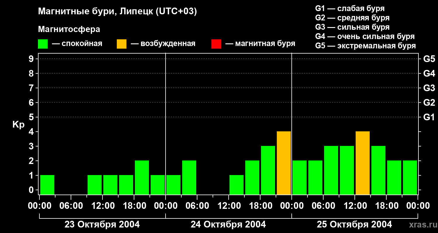 Изменения геомагнитного индекса Kp с 23 по 25 октября 2004 года для средних широт