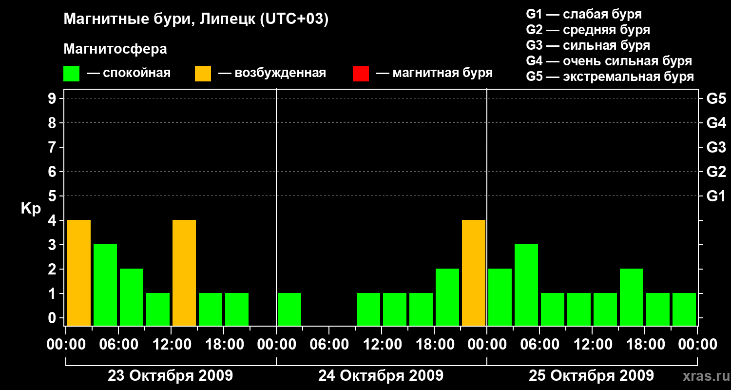 Изменения геомагнитного индекса Kp с 23 по 25 октября 2009 года для средних широт