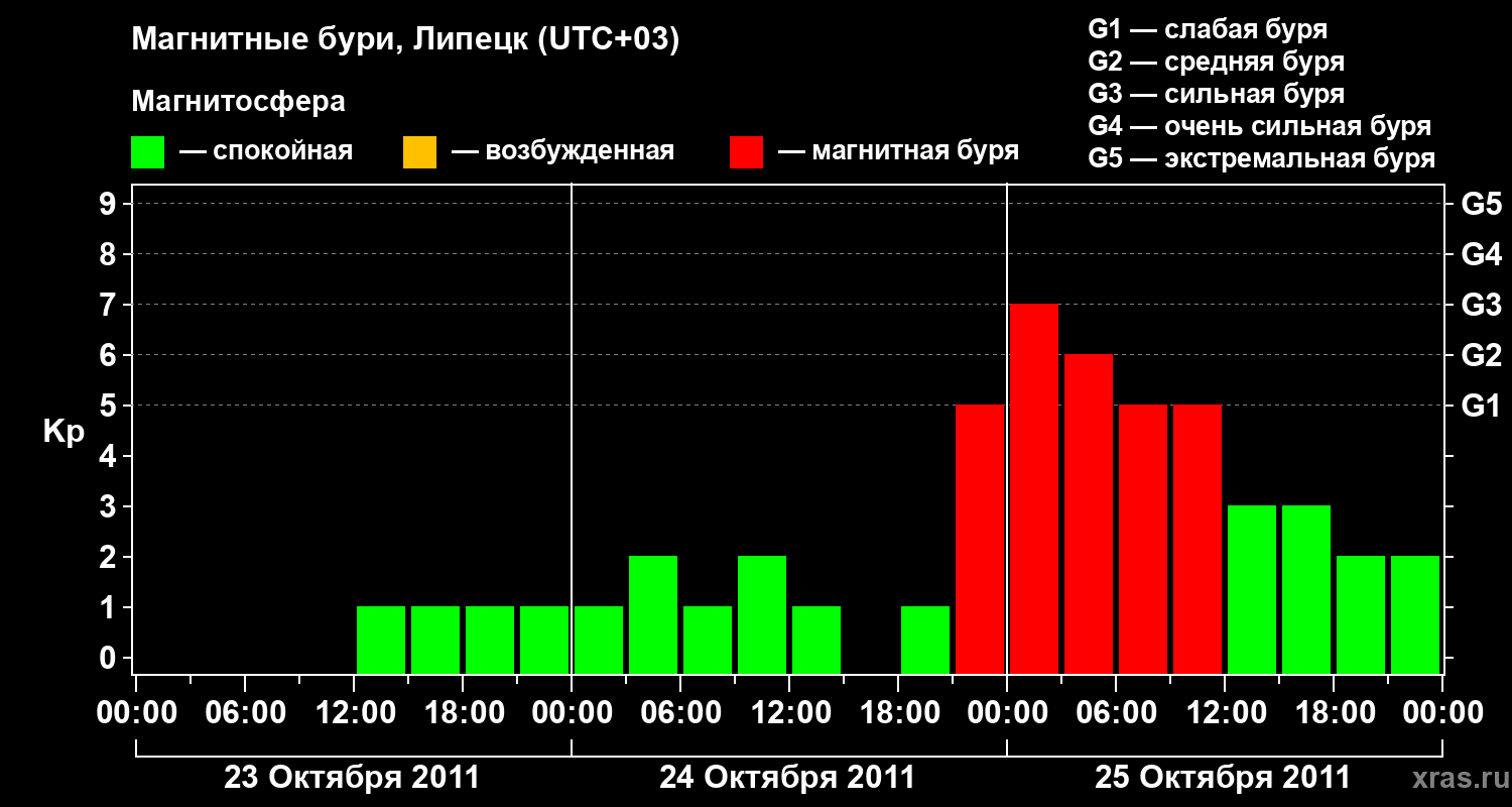 Изменения геомагнитного индекса Kp с 23 по 25 октября 2011 года для средних широт