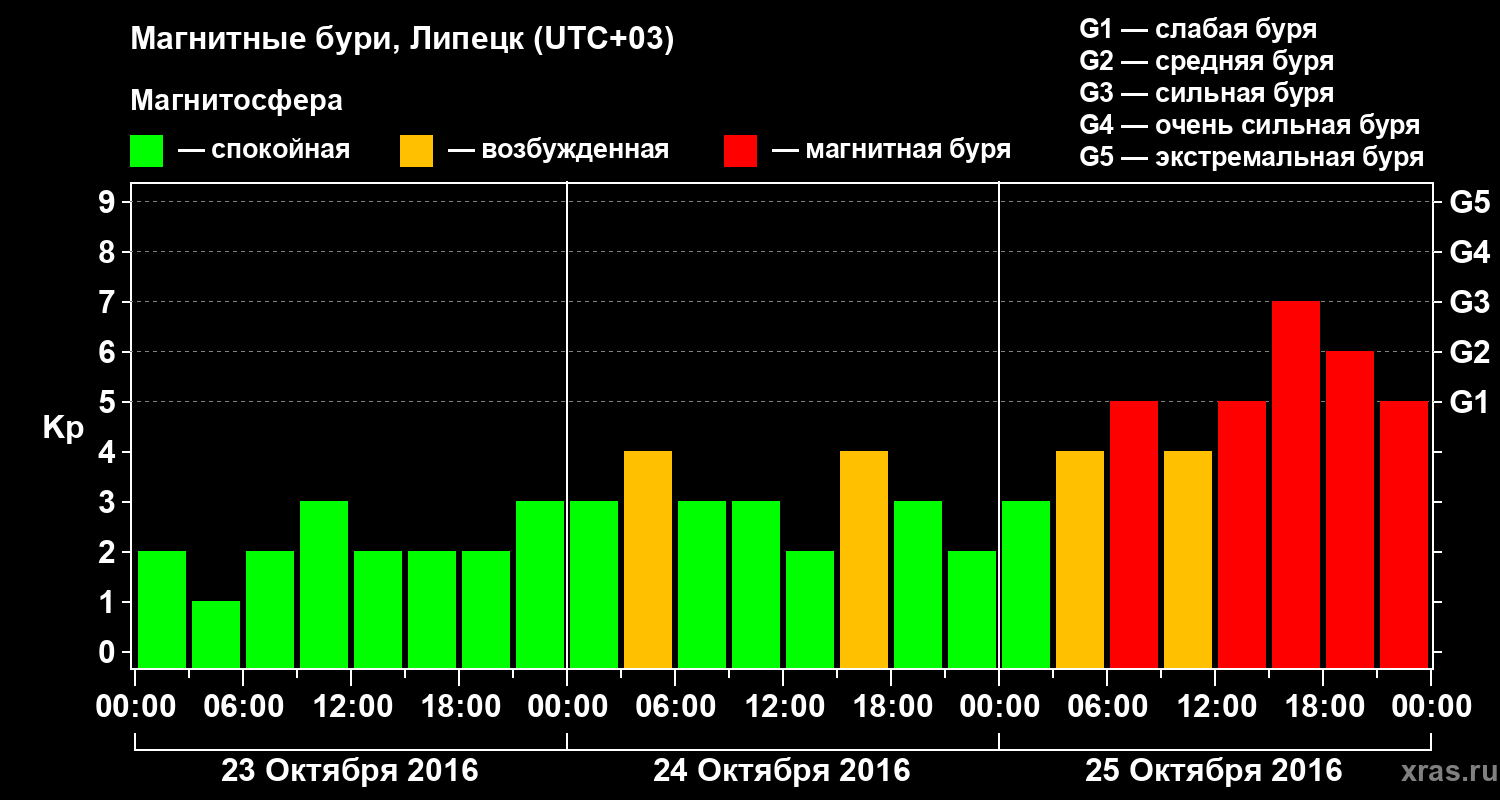 Изменения геомагнитного индекса Kp с 23 по 25 октября 2016 года для средних широт