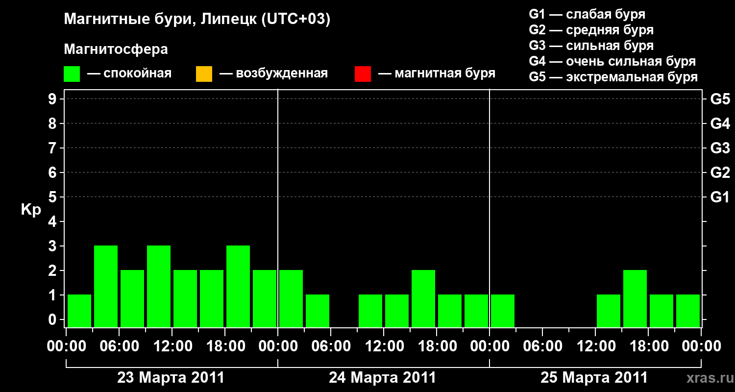Изменения геомагнитного индекса Kp с 23 по 25 марта 2011 года для средних широт