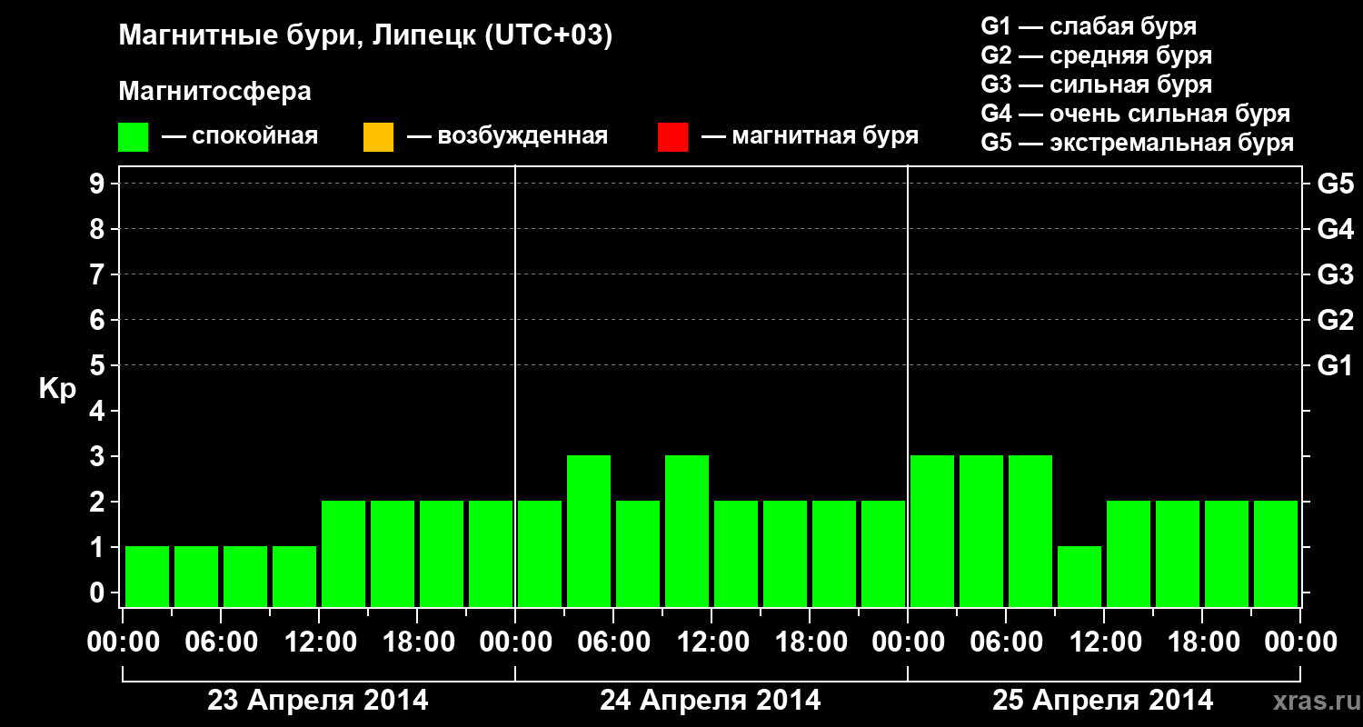Изменения геомагнитного индекса Kp с 23 по 25 апреля 2014 года для средних широт