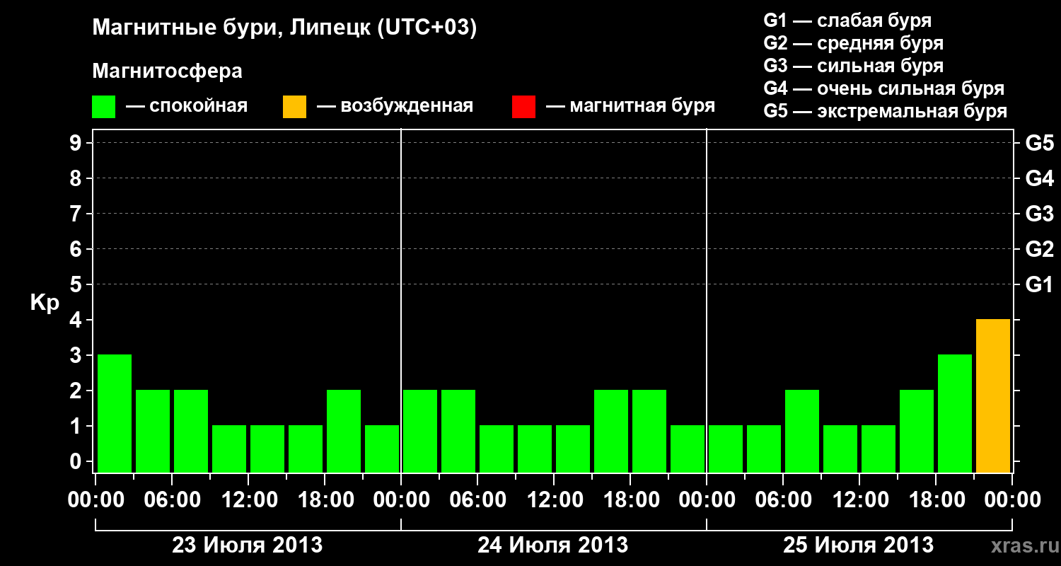 Изменения геомагнитного индекса Kp с 23 по 25 июля 2013 года для средних широт