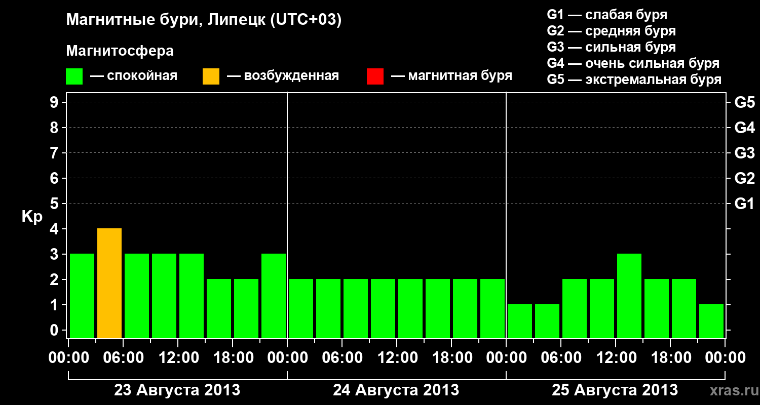 Изменения геомагнитного индекса Kp с 23 по 25 августа 2013 года для средних широт
