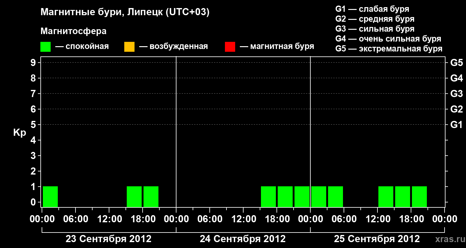 Изменения геомагнитного индекса Kp с 23 по 25 сентября 2012 года для средних широт